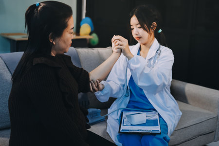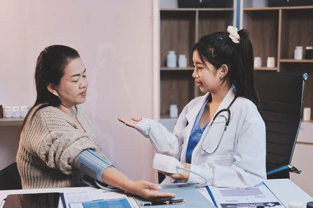 The female doctor measured blood pressure, the patient examined the heartbeat and sat down to talk about health care closely. health care concept.
