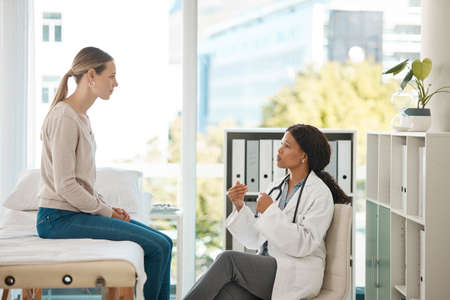 Gynecologist consulting patient before ultrasound examination. Gynecologist reassuring woman after gynecological exam. Post-exam consultation with gynecologist