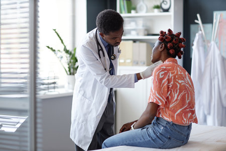 Waist up portrait of doctor wearing lab coat examining young woman by palpating neck and lymph nodes during consultation in clinic