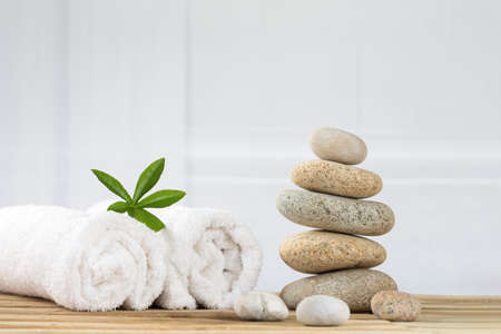 Creating a serene spa atmosphere with stacked stones, lush green leaves, and soft white towels, promoting relaxation and tranquility