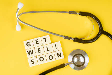 Medical concept. Layout of alphabet blocks and a stethoscope with text Get Well Soon. Selective focus points
