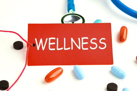 Wellness - word concept written on a red card on a stethoscope with pills on the surface