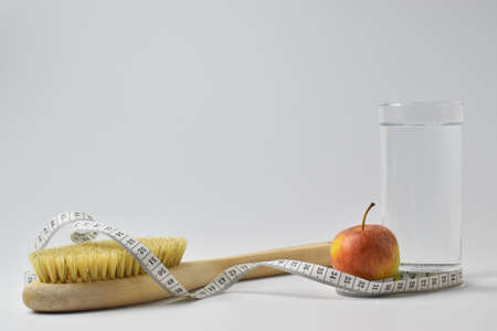The massage brush next to a measuring tape, an apple, and a glass of water on white