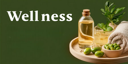 A serene display of wellness essentials including olive oil, fresh herbs, and soft towels, perfect for relaxation and self-care rituals.