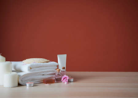 white clean cotton spa towel cloths prepared for day spa service on blue wooden table with massage oil bottle, essential oil, candle, and oil burner with background of vintage wooden wall in nice spa