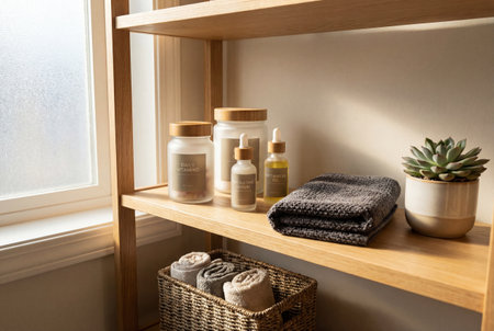 A wooden shelf in a modern bathroom displays jars of vitamins and bottles of hydrating serum and botanical oil next to a folded towel and a potted succulent plant bathed in soft natural sunlight.