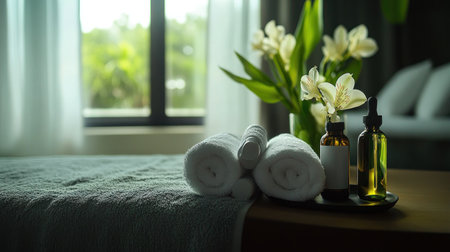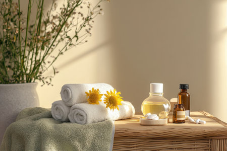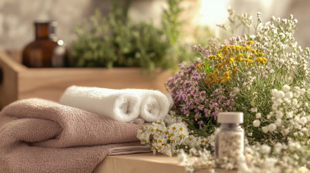 Immerse yourself in a calming spa atmosphere featuring soft towels, fresh herbs, and vibrant flowers. Perfect for promoting wellness and relaxation.
