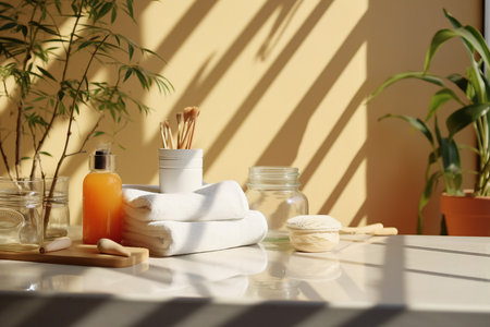 Various objects on a white tile background with warm sunlight shining through. generative AI.