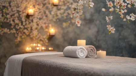 This serene spa scene features soft candles, fresh flowers, and cozy towels, creating a tranquil ambiance perfect for relaxation and rejuvenation. Ideal for wellness concepts.