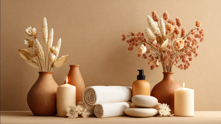 Display of dried flowers in a terracotta vase, candles, rolled towels, and smooth stones. The overall aesthetic is earthy and calming, suggestive of a spa or wellness-inspired setting. The colors are predominantly muted tones of beige, light brown, and cream.