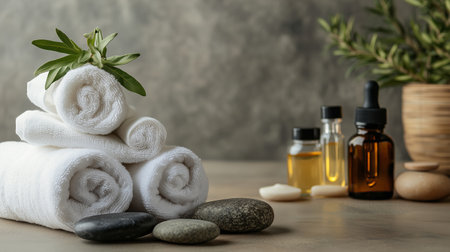 A soothing spa scene with rolled towel, smooth stones, and essential oils, creating a serene atmosphere for relaxation and self-care in a nature-inspired setting.