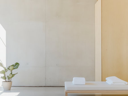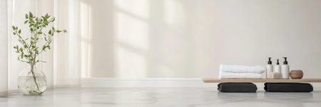 a minimalistic home spa with fresh flowers, scented oils, and a calming atmosphere --chaos 30 --ar 16:9 --v 6.1 Job ID: 80ee49c4-8302-4385-9602-611a7b929d7e