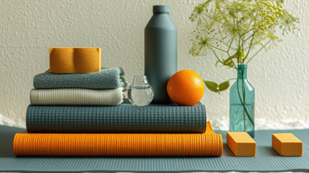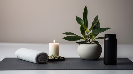 Yoga mats, bottles, and plant arranged on a simple surface with light and shadow
