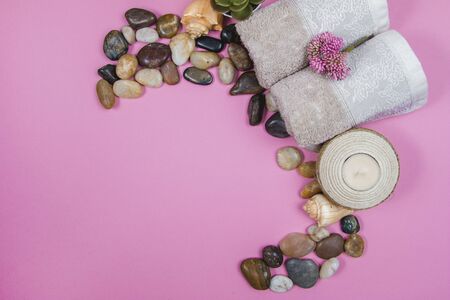 Spa still life with scented candles, stones, flowers and a bath towel. Horizontal photo. Horizontal photo.