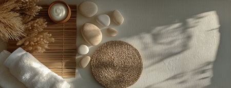 A serene spa setup showcases soft towels, smooth stones, calming cream, and warm light casting gentle shadows, creating a peaceful atmosphere for relaxation and self-care.