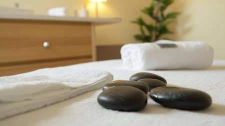 Relaxing spa setup with rolled towels, essential oils, and stones in a tranquil environment during a calm afternoon