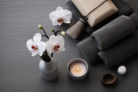 A serene arrangement of spa products, neatly displayed with towels and a beautiful floral centerpiece, creating a calming and elegant atmosphere perfect for relaxation.