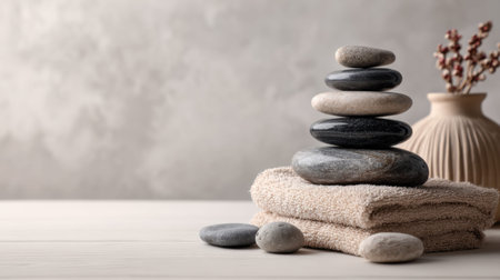 Discover a calming arrangement featuring soft towels, elegant bowls, and smooth stones, perfect for creating a soothing spa or wellness atmosphere in your space.
