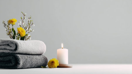 A peaceful spa setting featuring soft towels, fresh yellow flowers, and a flickering candle on a minimalist background, perfect for relaxation and self-care themes.