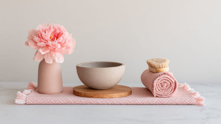 Discover an elegant spa arrangement featuring a pink flower, a ceramic bowl, a natural wooden stand, and soft accessories, perfect for relaxation and tranquility.