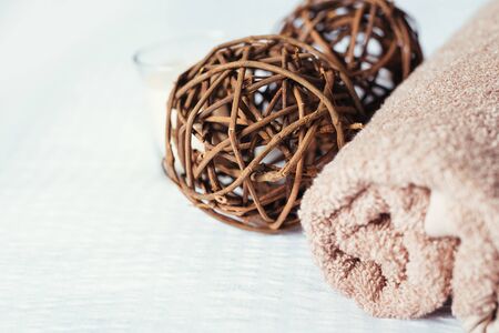 Spa, beauty and wellness background. Towel, cosmetic massage oil, leaf, flower, sea salt with shells and candle