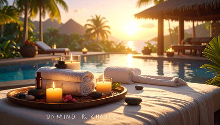 Tropical spa massage table with candles, towels, oil, and stones by pool at sunset