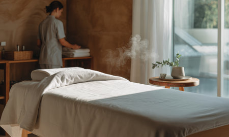 Empty massage bed in a tranquil spa room with a therapist preparing fresh towels. features natural light, a diffuser with steam, and a calming atmosphere for wellness and relaxation.