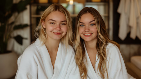 Cheerful young European females at luxury resort portrait image, ai generated. Beautiful caucasian women enjoying body care picture photorealistic photography. Spa treatment concept photo realistic
