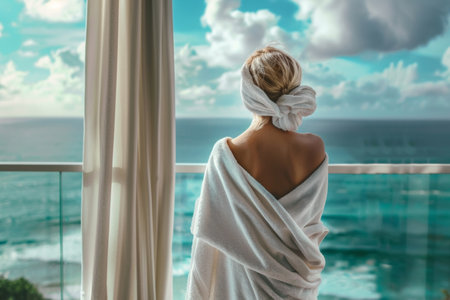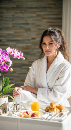 Beautiful woman in white bathrobe relaxing at elegant breakfast table with orchids, croissants and juice in upscale spa setting with stone walls
