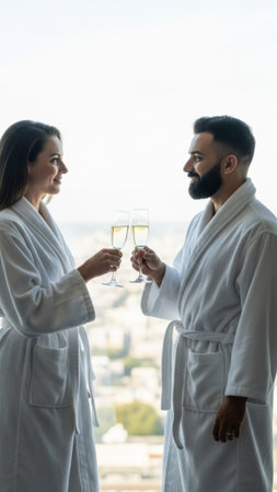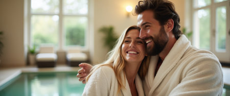 A joyful couple in plush white robes smiles warmly at each other, basking in the serene atmosphere of a luxurious spa. The tranquil pool and soft natural light enhance the intimate moment, reflecting their happiness and connection.