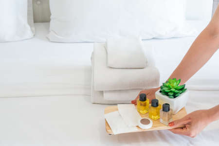 Hands of hotel maid put a set of hotel amenities (such as towels, shampoo, soap etc) on the bed. Hotel amenities is something of a premium nature provided in addition to the room when renting a room.