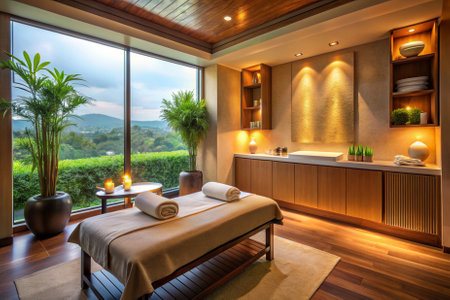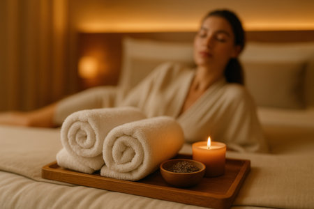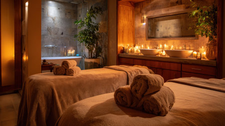 Immerse yourself in a tranquil spa interior featuring soft candlelight, aromatic oils, and cozy furnishings designed for relaxation and wellness experiences in a serene environment.