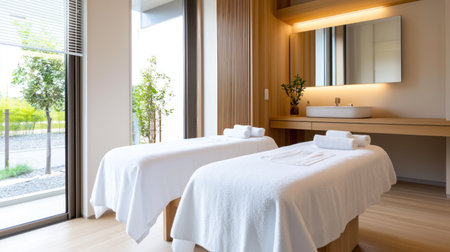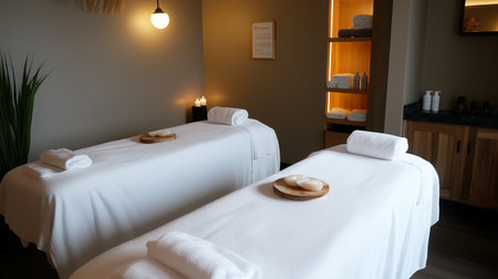 Relaxing spa treatment room with two massage tables in a serene environment designed for wellness and tranquility