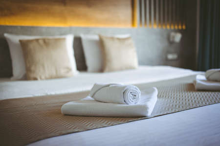 White towel on bed decoration in hotel bedroom interior - Vintage Light Filter