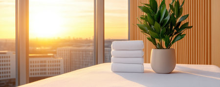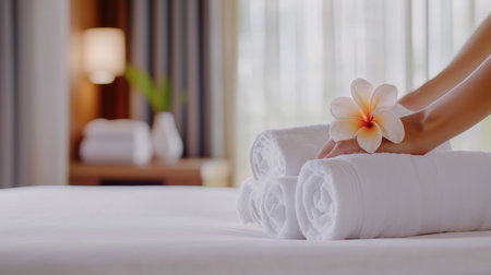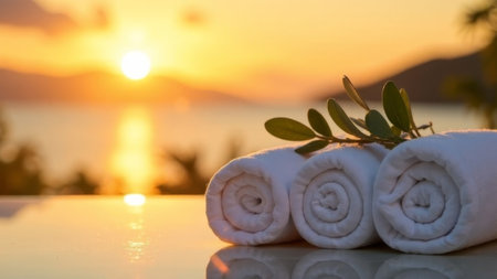 Luxurious spa setting with neatly arranged towels and a delicate flower at a tranquil resort in the afternoon sunlight