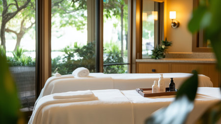 Relaxing spa setting with massage tables and natural light in a tranquil environment surrounded by greenery