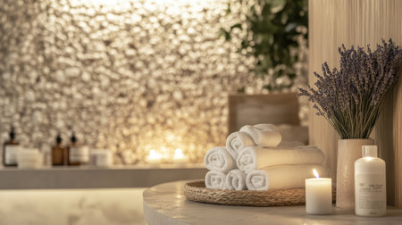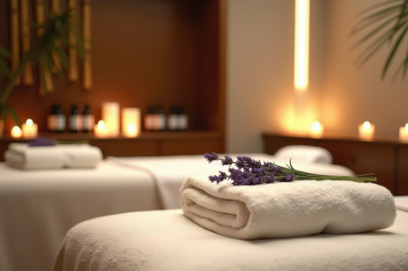 This serene spa interior features neatly arranged towels and candles, complemented by lavender and gentle lighting, creating a peaceful and relaxing atmosphere.