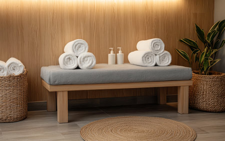 A tranquil relaxation area featuring neatly rolled towels on a bench decorative plants and warm lighting ideal for wellness activities and self-care moments to rejuvenate.