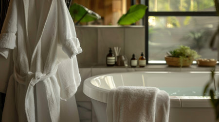 A plush white towel and a fluffy robe hang nearby inviting you to unwind and indulge in the tranquil setting. 2d flat cartoon