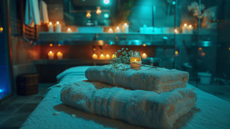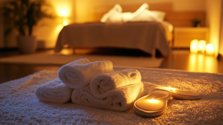 Peaceful Spa Room With Candlelight and Soft Towels in the Evening