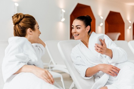 selective focus of attractive and smiling woman with cup and friend on background in spa