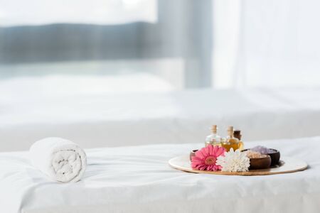 selective focus of tray with bottles of oil, bowls with sea salt and flowers in spa center