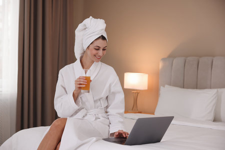 Beautiful woman in bathrobe with glass of juice working on laptop indoors. Space for text