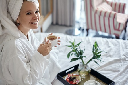 Beautiful Luxury Life. Breakfast. Happy Girl with a Cup of Coffee. Home Style Relaxation Woman Wearing Bathrobe and Towel after Shower. Spa Good Morning.