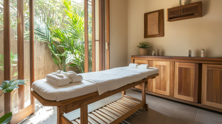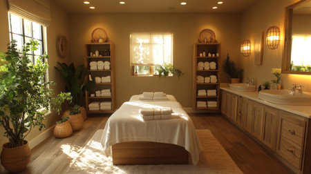 Elegant spa room designed for relaxation with a massage table and natural decor in a tranquil environment. Generative AI
