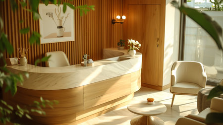Serene indoor spa with bamboo decor and floral arrangement by sunlit window. That the image is generated using AI.