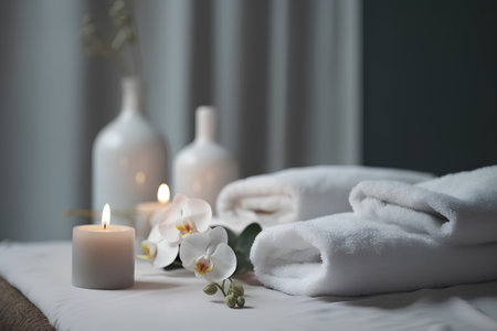 Spa and wellness setting with towels, candles and candles in a beauty salon