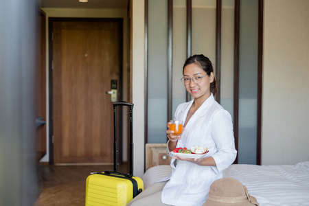 An Asian businesswoman sits on a bed in a hotel room, exhausted from a business trip, ready to receive a fruit snack from the hotel, arranged for VIP guests.