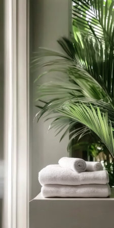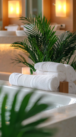 Relaxing spa atmosphere with plush towels and soothing greenery near the tranquil pool