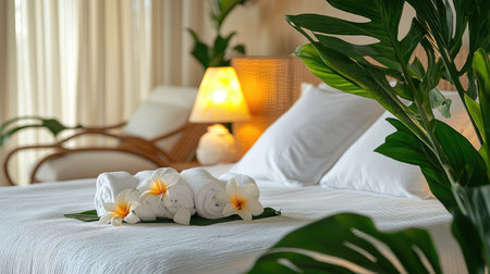 A beach resort bed decorated with tropical flowers and white towels in a serene, airy room.